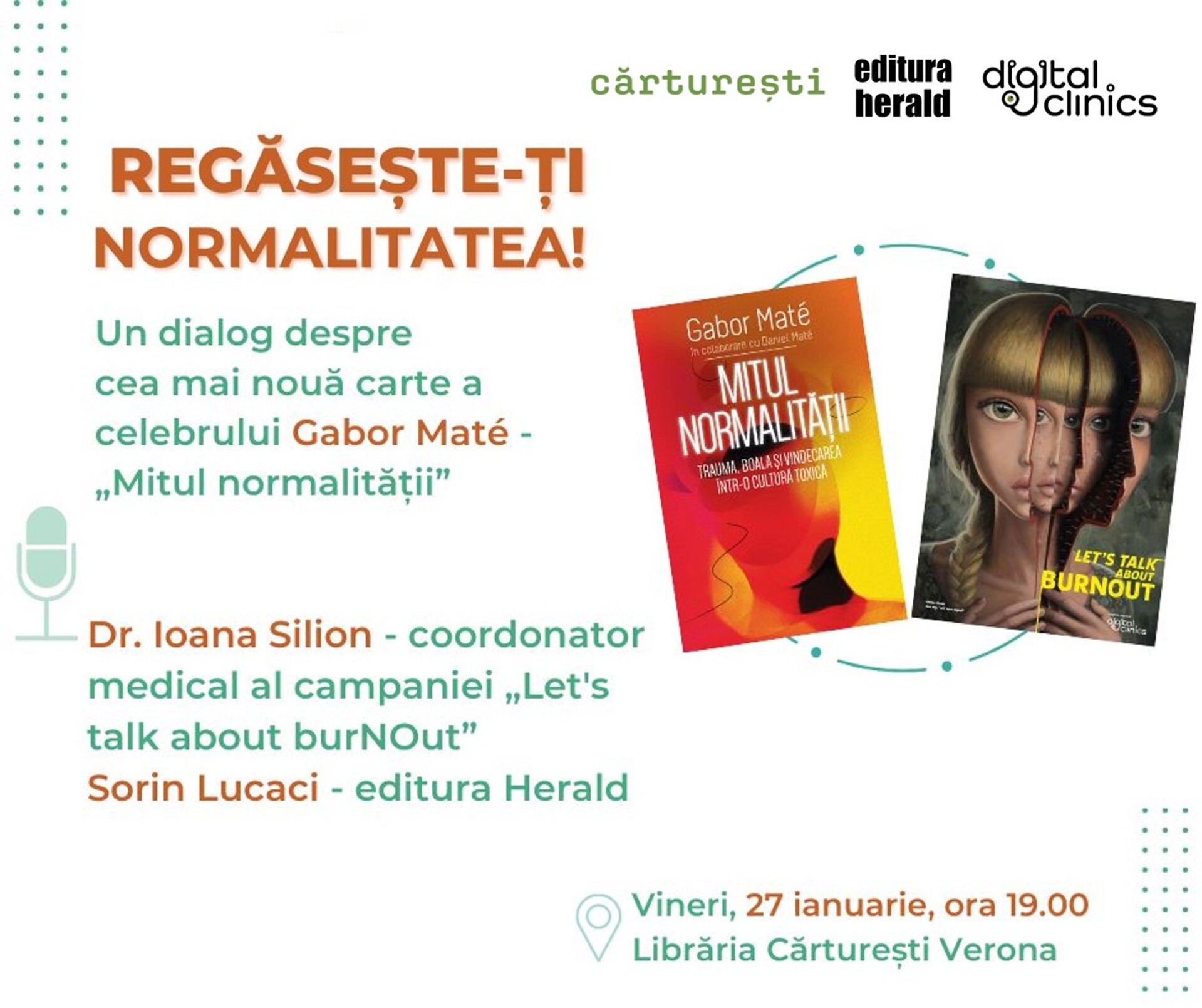 „Regăsește-ți normalitatea” vă propune un dialog pornind de la cea mai nouă carte a celebrului Gabor Maté, „Mitul normalității”, alături de invitații: dr. Ioana Silion, medic psihiatru, coordonator medical al campaniei inițiate de Digital Clinics și Sorin Lucaci, coordonator evenimente Editura Herald. Evenimentul va fi transmis și live, pe pagina de Facebook Digital Clinics.