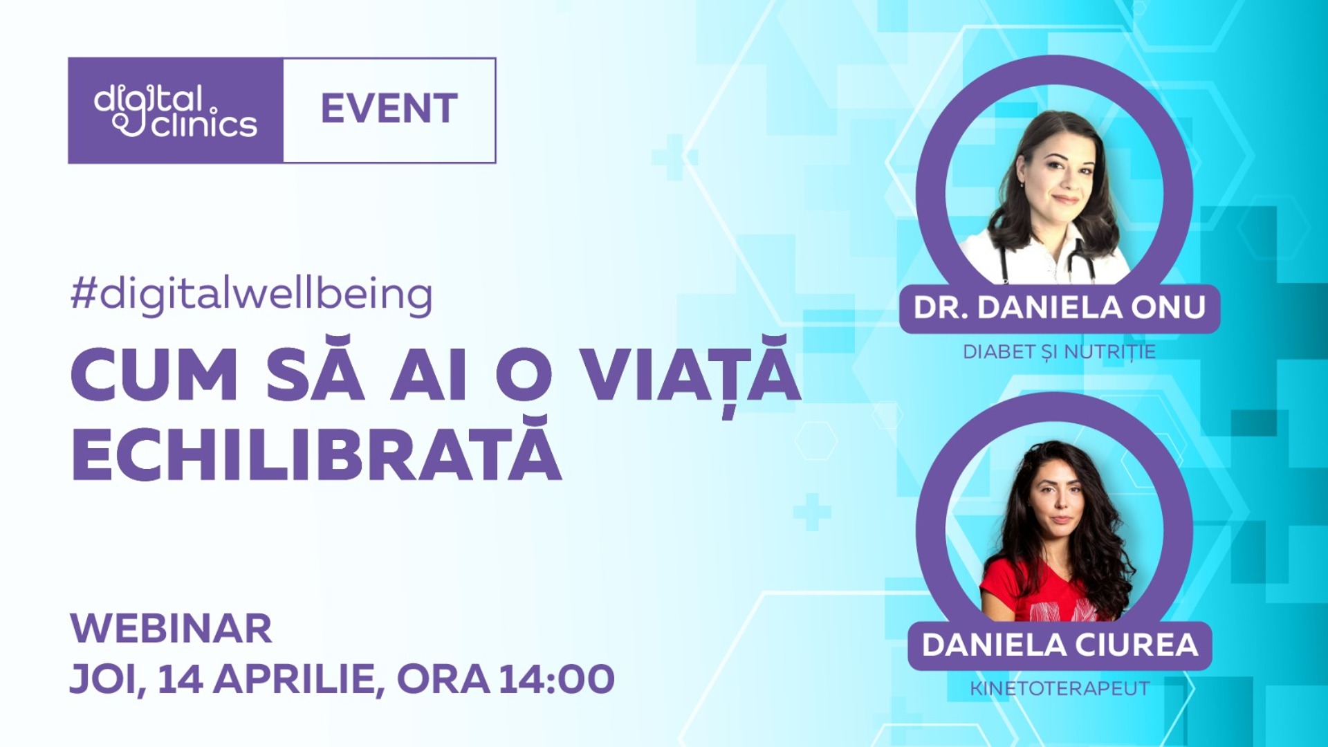 Specialiștii invitați la webinar sunt Dr. Daniela Onu, medic specialist diabet și nutriție și kinetoterapeut Daniela Ciurea, specializată în Balneo-Fiziokinetoterapie și Recupererare. Mai multe detalii sunt disponibile aici: Webinar Digital Clinics