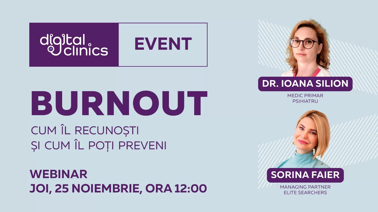 Platforma independentă de telemedicină Digital Clinics deschide seria evenimentelor online cu un webinar dedicat „bolii profesionale a secolului”, burnout-ul. Te invităm să descoperi, alături de medici și specialiști de top din domeniul Resurselor Umane, cele mai noi și interesante detalii despre această problemă care ne poate afecta grav atât viața personală, cât și pe cea profesională.