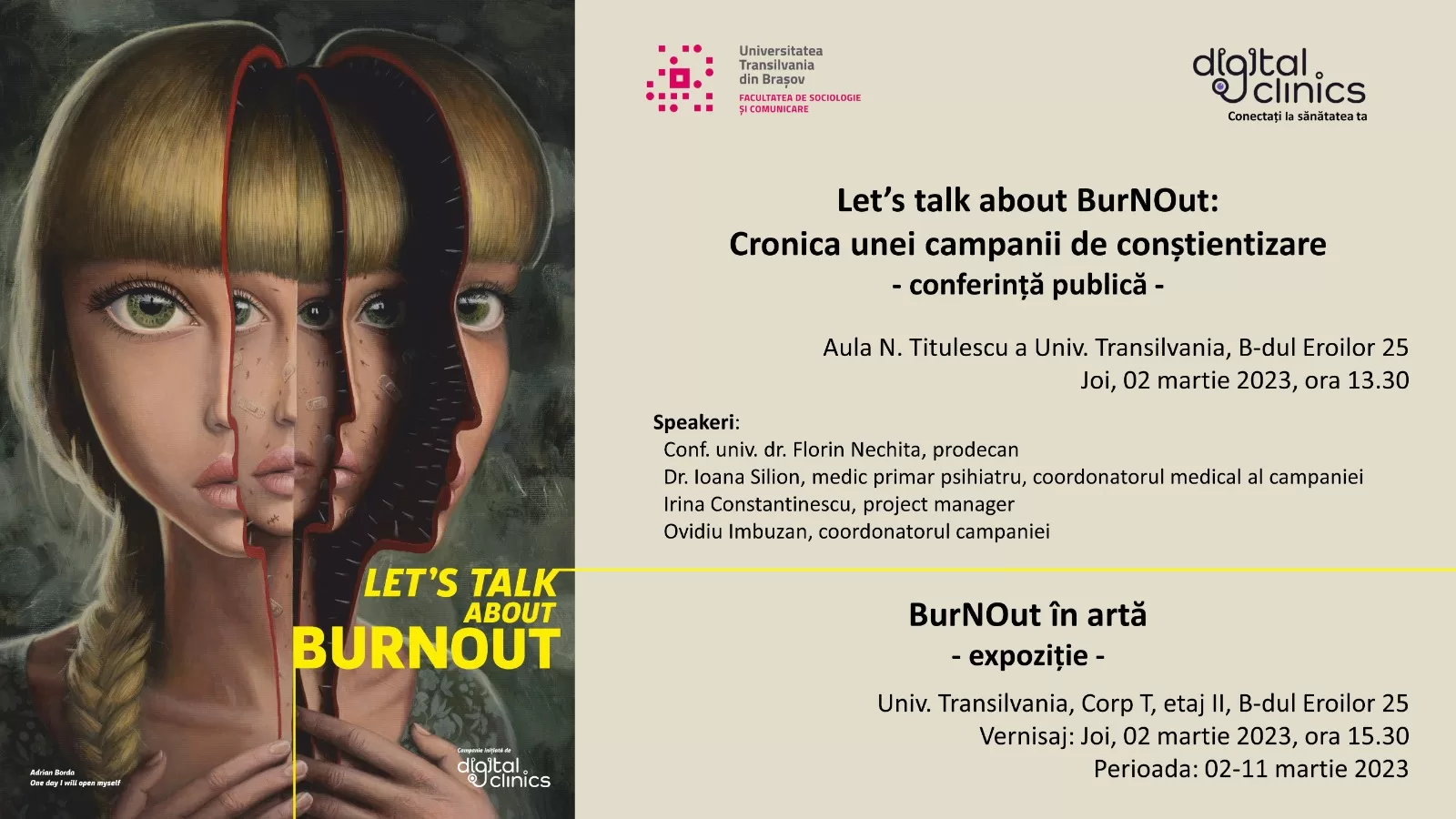 Digital Clinics continuă seria evenimentelor din cadrul campaniei de conștientizare Let’s talk about BurNOut. La invitația Facultății de Sociologie și Comunicare din cadrul Universității Transilvania din Brașov, joi, 02 martie 2023, începând cu ora 13.30, în corpul T al Universității, B-dul Eroilor 25, vor avea loc conferința publică Let’s talk about BurNOut: Cronica unei campanii de conștientizare și vernisajul expoziției BurNOut în artă.